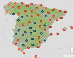 Durante el fin de semana, se espera que la tendencia ligeramente ascendente de las temperaturas pueda continuar en áreas de la mitad sur y este peninsular, trasladándose el domingo al área cantábrica y norte de Galicia, donde los ascensos podrán ser significativos. Se espera que se vuelvan a superar los 40-42ºC en las mismas zonas previamente mencionadas, y sin descartarlos el domingo en puntos del País Vasco. En lo relativo a las temperaturas mínimas, no se espera que se baje de los 23–25ºC en amplias zonas del centro y sur peninsular, así como en torno al litoral mediterráneo.
