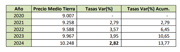 En el contexto nacional, este indicador se situó el pasado año en 10.248 euros por hectárea, lo que supone un aumento del 2,8% en precios corrientes con respecto al año anterior. Este dato consolida la tendencia creciente de los últimos años, con una variación acumulada del 13,8 % desde 2020.