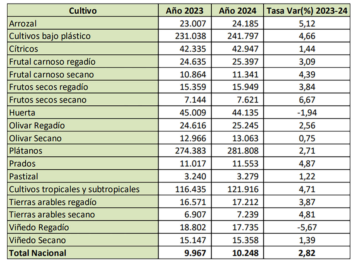 En cuanto a tipos de cultivo, los mayores incrementos a nivel nacional en 2024 se registraron en los frutos secos de secano (6,7%), aunque parten de un nivel de precio medio más bajo (7.261 €/ha). Otros incrementos significativos son los precios de los cultivos de arroz (5,1%), cultivos bajo plástico y de tropicales y subtropicales (4,7%) y de las plataneras (2,8%).
