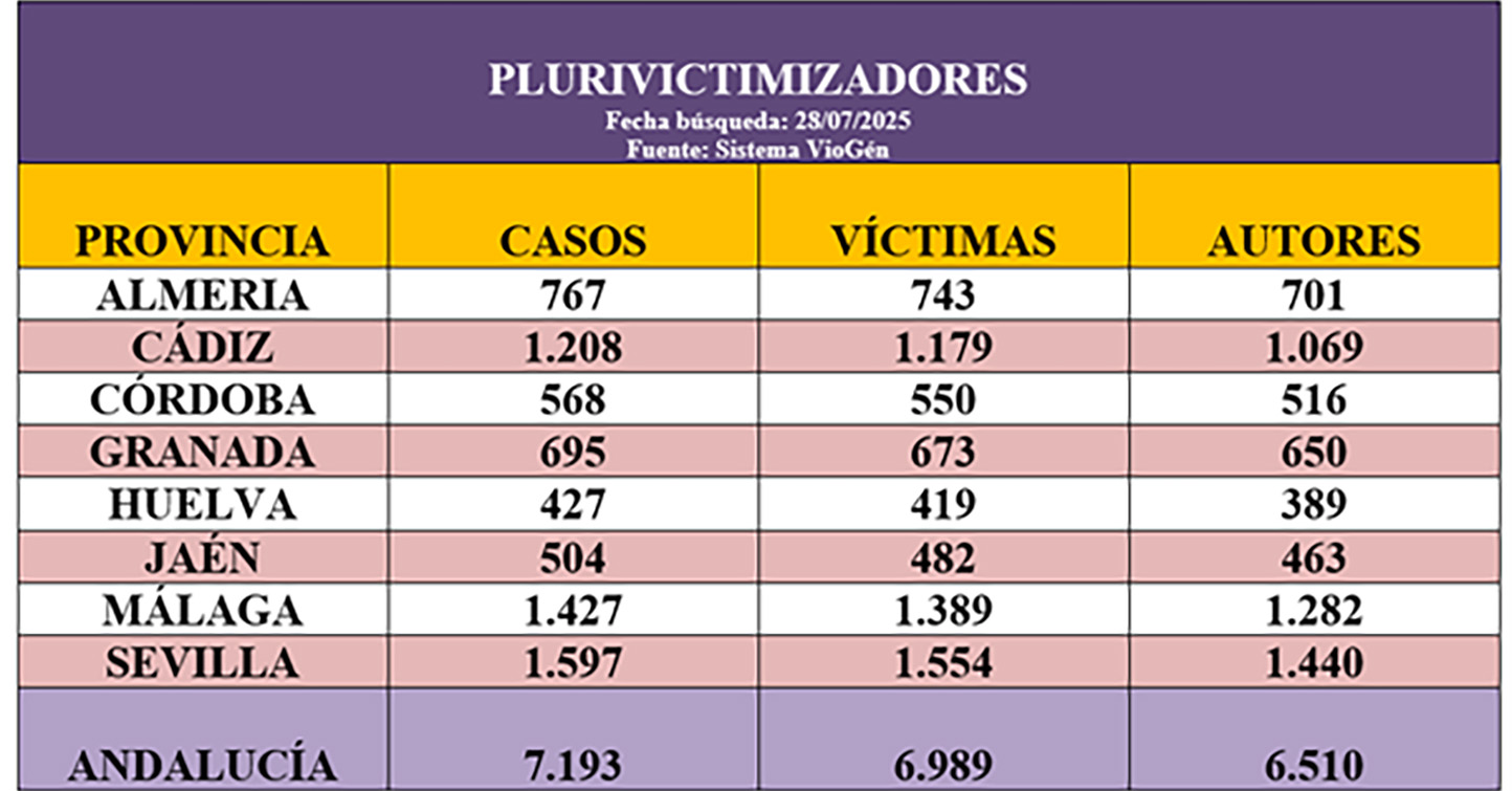 Andalucía registra más de 7.100 agresores reincidentes por violencia machista en julio. Andalucía cerró el mes de julio con 7.193 casos de plurivictimizadores por violencia de género, es decir, agresores reincidentes con más de una víctima, según los datos del Sistema VioGén. En total, se contabilizaron 6.510 agresores y 6.989 víctimas, lo que ha llevado a reforzar las medidas de supervisión sobre este perfil de maltratadores.