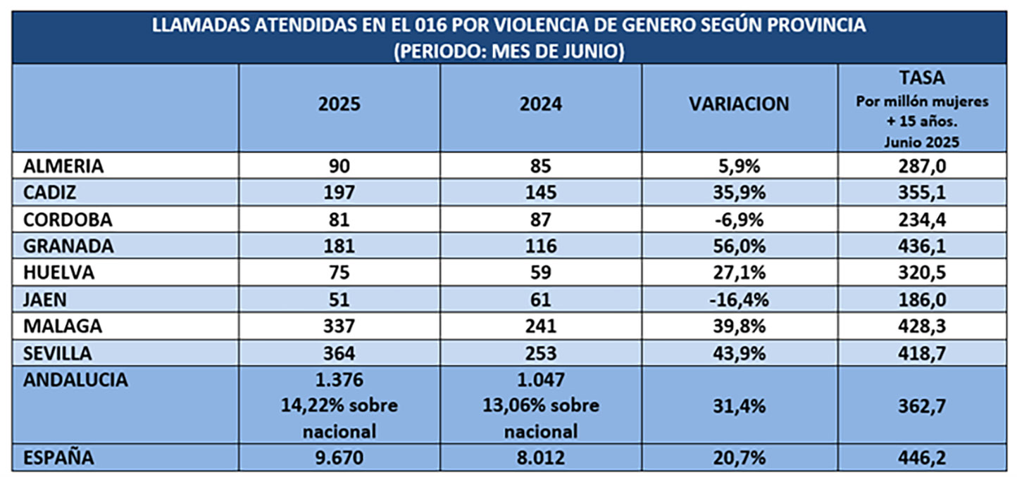 Para atender y proteger a las mujeres en situación de riesgo, la comunidad cuenta con varios recursos como el teléfono 016, que registró en junio un aumento del 31,4% en las llamadas respecto al mismo mes de 2024. En total, Andalucía concentró el 14,22% de todas las atenciones a nivel estatal. Este servicio ofrece asesoramiento legal, atención psicológica y derivación a recursos especializados, además de canales como WhatsApp (600 000 016) y correo electrónico (016-online@igualdad.gob.es), disponibles en 52 idiomas y adaptados a personas con discapacidad.