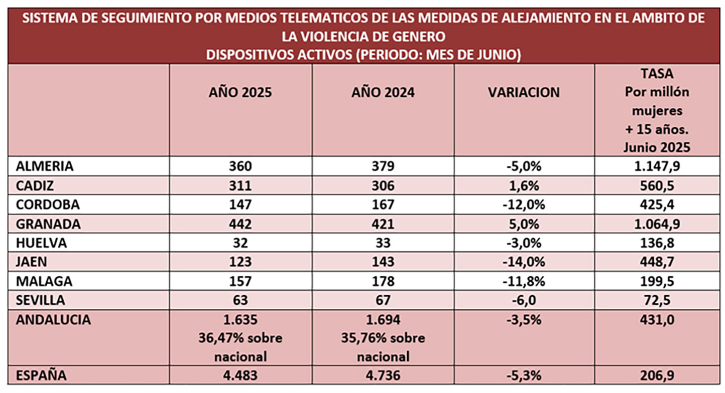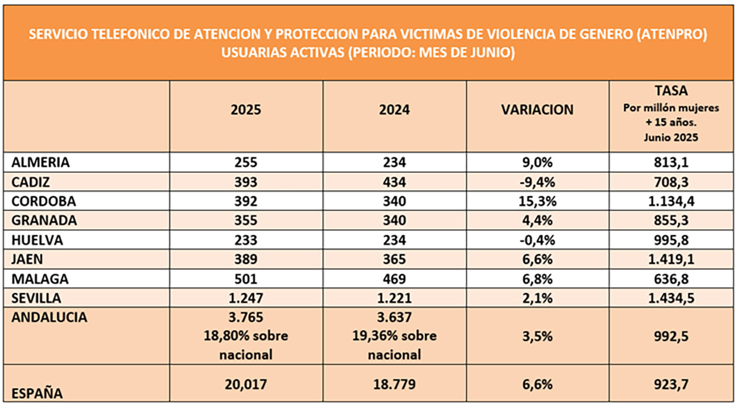 Otro recurso fundamental es el servicio Atenpro, que utiliza dispositivos con geolocalización y botón de emergencia. En junio se realizaron 3.765 atenciones en Andalucía, lo que representa el 18,8% del total nacional y un aumento del 3,5% respecto al año anterior.