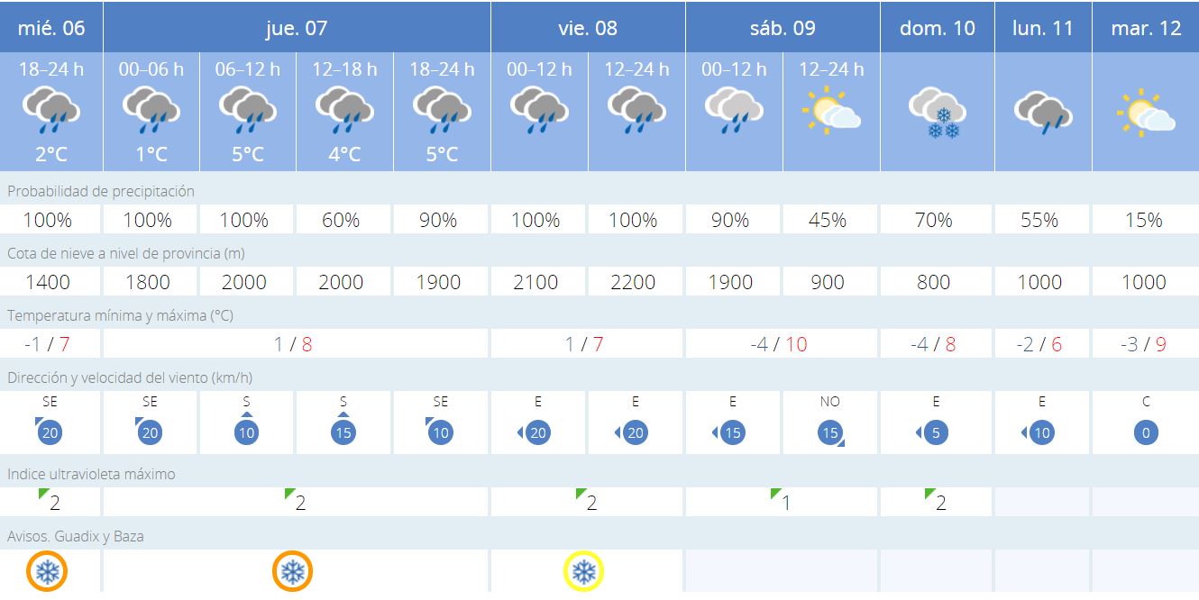 En el caso del norte granadino, ayer se iniciaba una nueva alerta de nivel naranja por acumulación de nieve de hasta 10 cm de espesor, en el plazo comprendido entre las seis de la tarde de ayer y las 12 de la próxima madrugada, tras lo que la alerta pasa a nivel amarillo, con previsiones de 4 cm de espesor y estando vigente a lo largo de toda la jornada, si bien dependiendo de la cota a la que lleguen las posibles nieves.