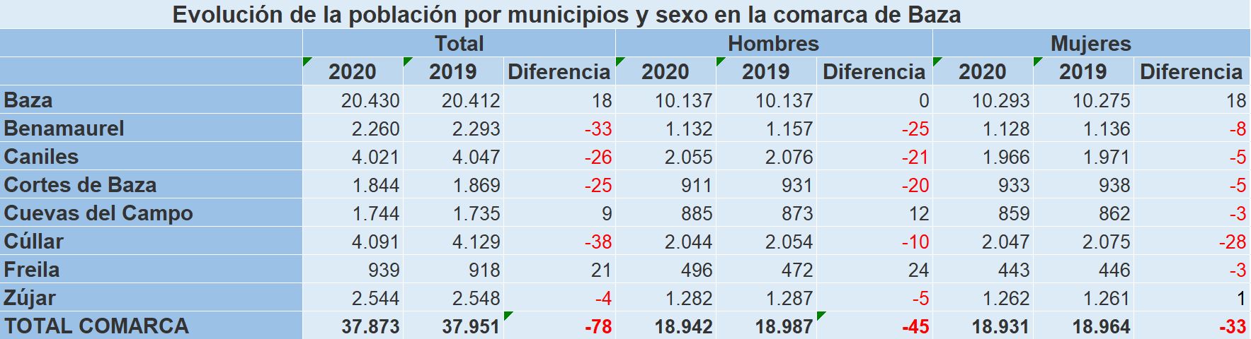 Como datos curiosos, decir que el aumento total que se ha producido en Baza ha sido solamente en la población femenina, mientras que en los municipios de Benamaurel, Caniles y Cortes de Baza el mayor descenso ha sido en el apartado de los hombres, al contrario que en Cúllar, donde han sido mayores las bajas femeninas.