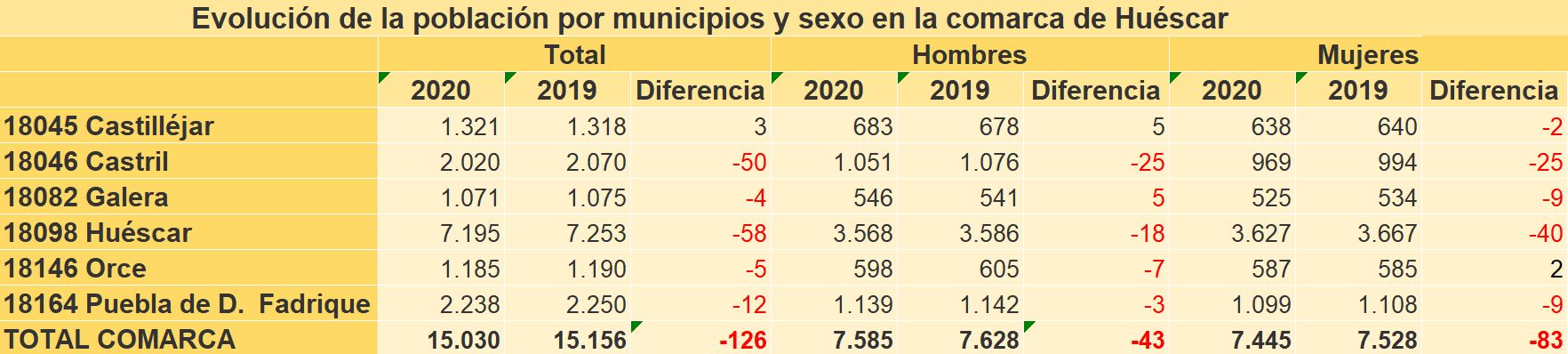 En cuanto a la comarca oscense, el primer dato en llamar la atención es la baja generalizada de población en todos sus municipios, excepto en Castilléjar, que han crecido en tres personas, tras sumar 5 hombres y restar dos mujeres.