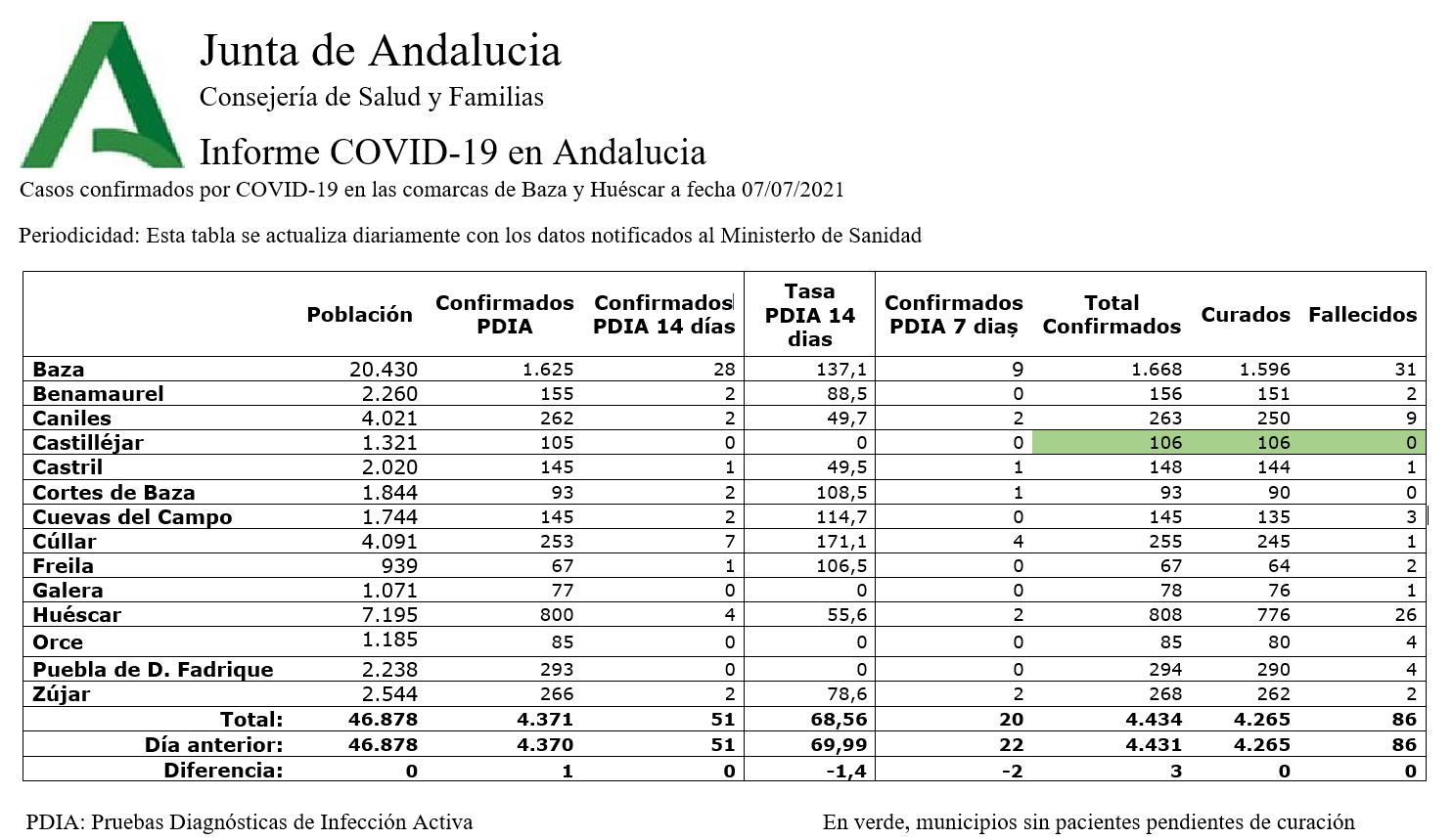 Y por lo referente a la información de la Consejería de Salud de la Junta de Andalucía, referida a las comarcas de Baza y Huéscar, decir que apenas ha habido un cambio mínimo de 1,4 punto en la tasa de incidencias a 14 días, destacando un pequeño descenso en los pacientes confirmados a 7 días y que no se haya sumado ningún curado más, todo lo cual queda reflejado en la tabla que acompaña a esta noticia.