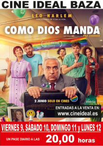 Este fin de semana, el Cine Ideal Baza ofrece una divertida comedia, políticamente Incorrecta: “Como Dios manda”. Se trata de una película dirigida por Paz Jiménez, la cual está protagonizada por Leo Harlem, Maribel Salas, Stéphanie Magnin, Daniel Pérez Prada y Julián Villagrán, entre otros.