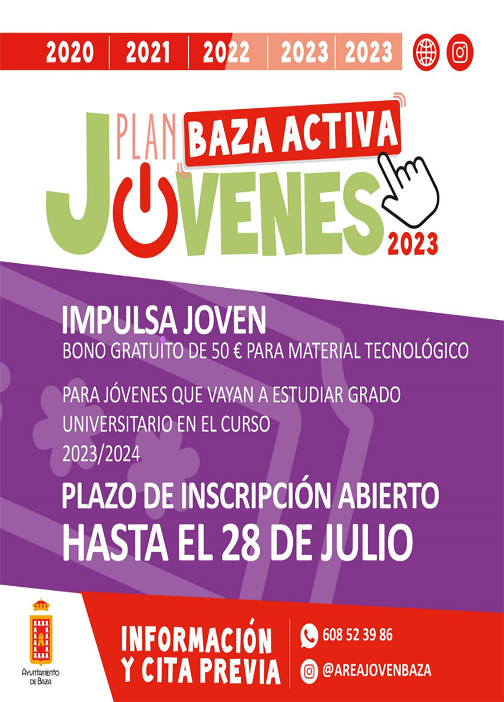 Abierto el plazo para solicitar las ayudas del Plan Impulsa Joven del Ayuntamiento de Baza dirigidas a estudiantes universitarios. El Ayuntamiento de Baza informa que ya se ha abierto el plazo de presentación de solicitudes para el programa Impulsa Joven dirigido a promover el acceso a nuevas tecnologías para el fomento de estudios universitarios. En concreto, se convocan ayudas de 50 euros en especie para la adquisición de material tecnológico en empresas de Baza.