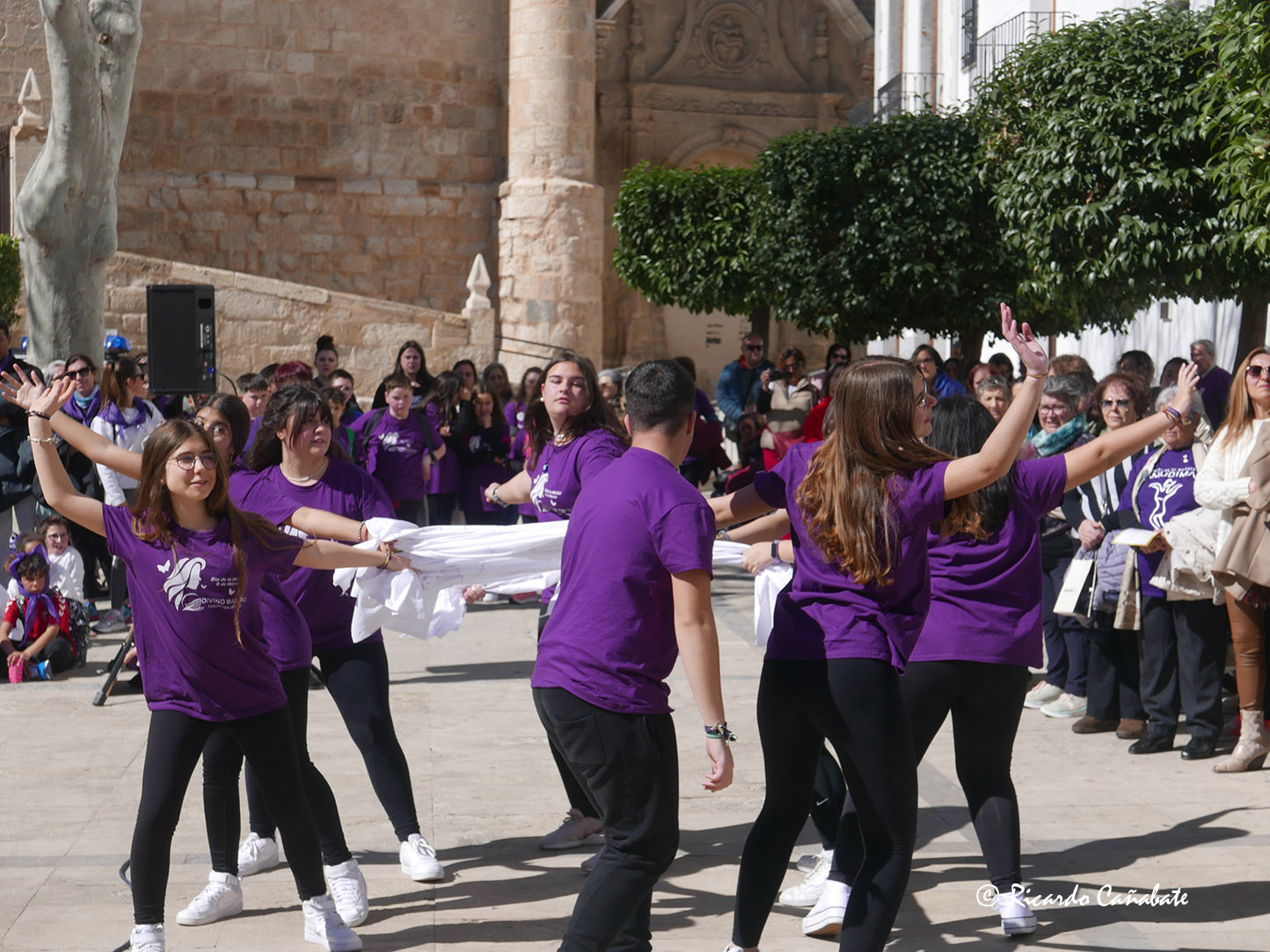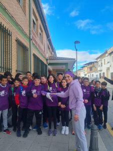 La jornada arrancaba a primera hora de la mañana, con una original carrera de relevos entre todos los centros educativos de Primaria y de Secundaria de la ciudad, con un testigo morado en el que cada uno de los centros colocaba una serie de reflexiones e ideas que trasladaban corriendo de un centro a otro, para intercambiarlo y hacer que esas ideas recorrieran toda la ciudad. Los centros educativos fueron después una parte importante del acto que se celebró en la Plaza Mayor bastetana.