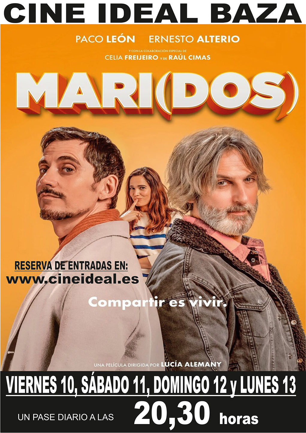 Este fin de semana, en el Cine Ideal Baza, estreno de la película “Mari-dos”, una divertida y disparatada comedia sobre el amor, la amistad y la lealtad. Una película española de este mismo año de 2023, dirigida por Lucía Alemany, con un guion de Pablo Alén y Breixo Corral e interpretada en sus principales papeles por Paco León, Ernesto Alterio, Celia Freijeiro, Raúl Cimas, Emma Hernández, Lucía Gómez, María Córdoba, Kirill Bunegin, Marta Costa