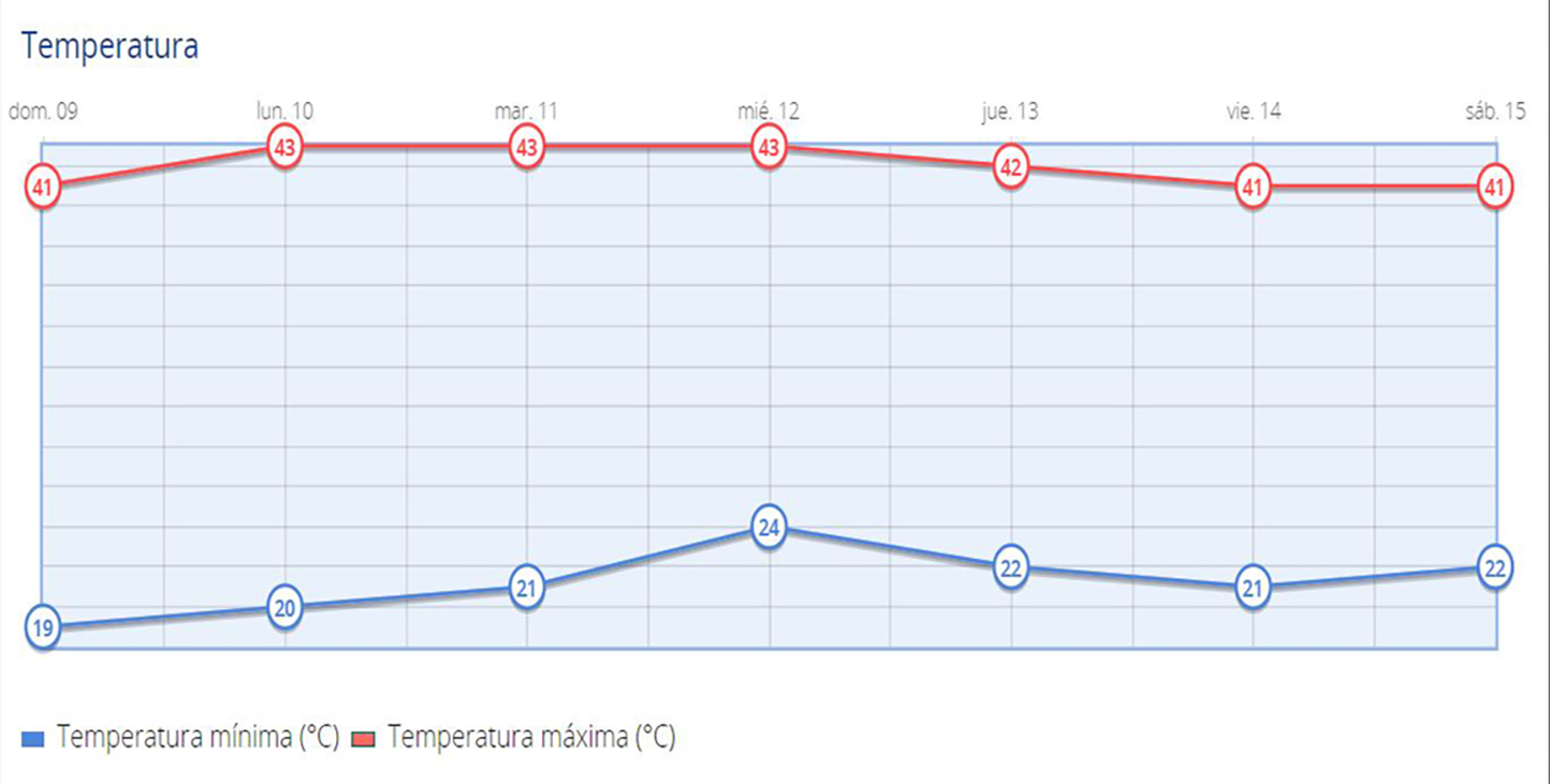 La ola de calor que afectará a España en los próximos días, llegaba ayer a Baza para seguir subiendo todavía más las temperaturas, por lo que AEMET declara “Riesgo extremo”. Efectivamente, así es. Llega el calor “de verdad”: el de notarlo donde nunca se nota, el de no dormir, el que aprieta de noche y de día… ya está aquí. De hecho, ayer ya teníamos un anticipo cuando, diez minutos antes delas cinco de la tarde, se alcanzaba la máxima de la jornada, con 40,6ºC y una mínima bastante apetecible de 17,5ºC, a las siete y diez de la mañana, superando así las temperaturas de los días previos, que oscilaron con máximas entre 35,02 del domingo 2 de julio a los 37,0ºC del pasado sábado y mínimas de entre los 14,8 del miércoles 5 a los 20,4 del viernes 7, única jornada en la que este parámetro subió de los veinte grados.