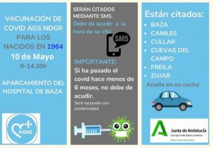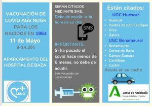 Actualización de fechas de nacimiento en las vacunaciones a realizar hoy y mañana. Informaciones ofrecidas desde el AGS Nordeste de Granada anuncian que los próximos días 10 y 11 de mayo se vacunará contra la COVID, desde las 9:00 h. hasta las 14:30 h., a las personas nacidas en 1964, en el recinto instalado en el aparcamiento nuevo del Hospital de Baza.