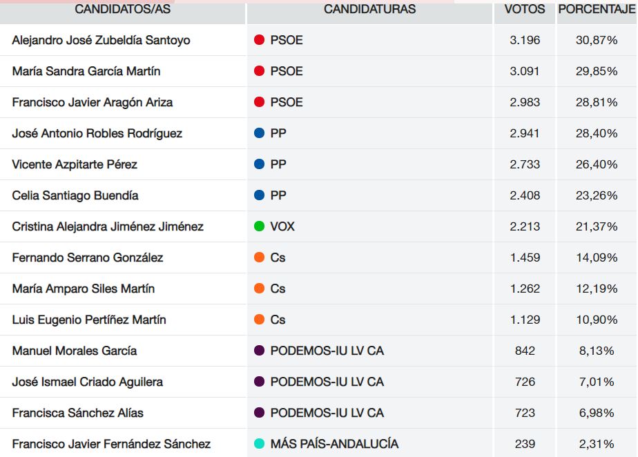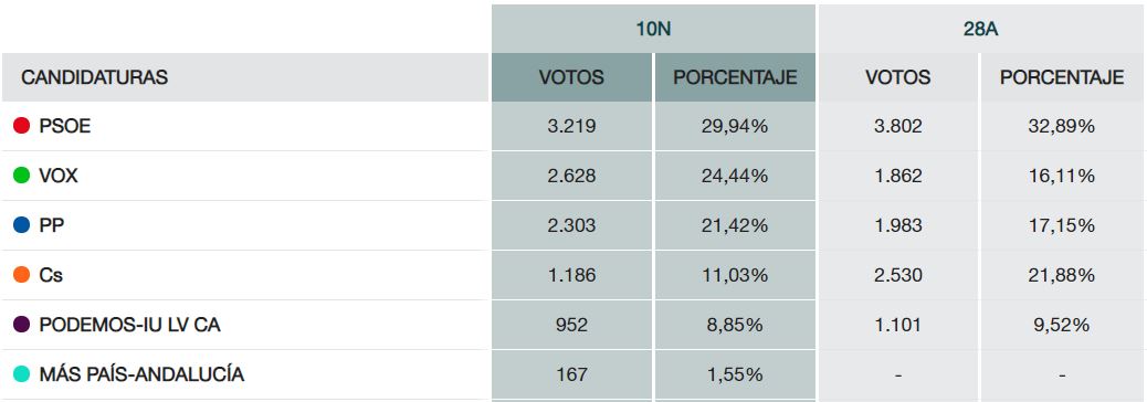 Más descolgado queda Ciudadanos, que solo consigue 1.186 votos y pierde 1.344 con respeto a las generales de abril. Un importante bajón que sigue la tónica a nivel nacional y andaluz. Su cabeza de lista por Granada, Fran Hervías, ha estado varias veces en Baza antes y durante la campaña electoral pero los resultados de ayer demuestran que no ha conseguido conectar con los bastetanos.