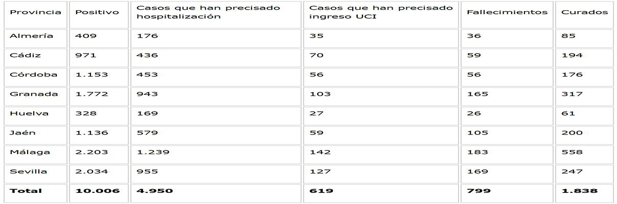 El comunicado sobre Coronavirus del 12 de abril reduce el número de pacientes ingresados y el de pacientes en las UCI. La Consejería Salud y Familias informa que se han confirmado en Andalucía 294 nuevos casos de Coronavirus en las últimas horas. Así, el número total de afectados en Andalucía asciende a 10.006. Actualmente, 1.656 pacientes confirmados con COVID-19 permanecen ingresados en los hospitales andaluces, es decir, 106 menos que el viernes y 343 menos que el Jueves Santo, de los que 366 se encuentran en UCI, lo que supone un importante descenso en el número de hospitalizaciones convencionales e ingresos en las Unidades de Cuidados Intensivos.