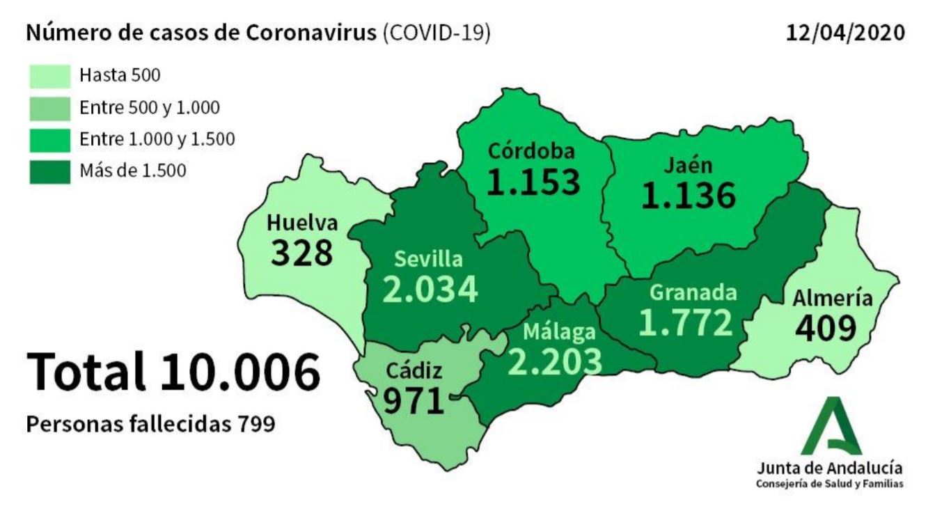 El comunicado sobre Coronavirus del 12 de abril reduce el número de pacientes ingresados y el de pacientes en las UCI. La Consejería Salud y Familias informa que se han confirmado en Andalucía 294 nuevos casos de Coronavirus en las últimas horas. Así, el número total de afectados en Andalucía asciende a 10.006. Actualmente, 1.656 pacientes confirmados con COVID-19 permanecen ingresados en los hospitales andaluces, es decir, 106 menos que el viernes y 343 menos que el Jueves Santo, de los que 366 se encuentran en UCI, lo que supone un importante descenso en el número de hospitalizaciones convencionales e ingresos en las Unidades de Cuidados Intensivos.