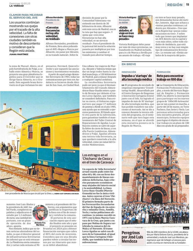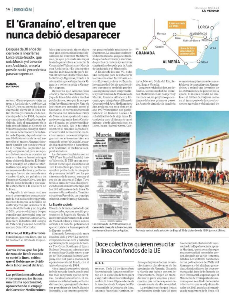El diario murciano “La Verdad” dedicaba ayer un artículo al tren conocido como “El Granaíno” mientras crece la presión social y económica para recuperar su itinerario. Ayer domingo se publicaba en este diario murciano el artículo firmado por Manuel Nuitrago en el que recuerda que son ya más de 38 los años que el tren recorrió la vía que unía tierras murcianas, partiendo desde Almendricos para dirigirse hacia Baza y seguir por Guadix hasta Granada.