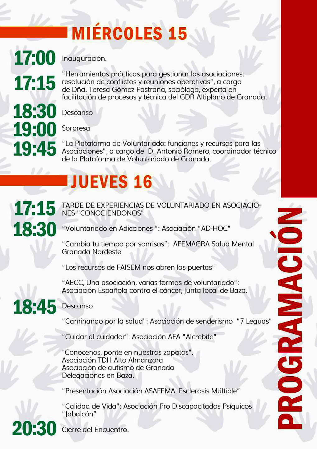 El jueves 16 se ha previsto una tarde de experiencias de voluntariado en asociaciones, que se presenta bajo el título “Conociéndonos”. A las 18.30 intervendrán Ad-Hoc, Afemagra, Faisem y AECC. Tras el descanso será el turno de Asociación de Senderismo 7 Leguas, AFA Alcrebite, la delegación en Baza de la Asociación de Autismo de Granada y de la Asociación TDH Alto Almanzora, Asafema y Asociación Pro Discapacitados Psíquicos Jabalcón.