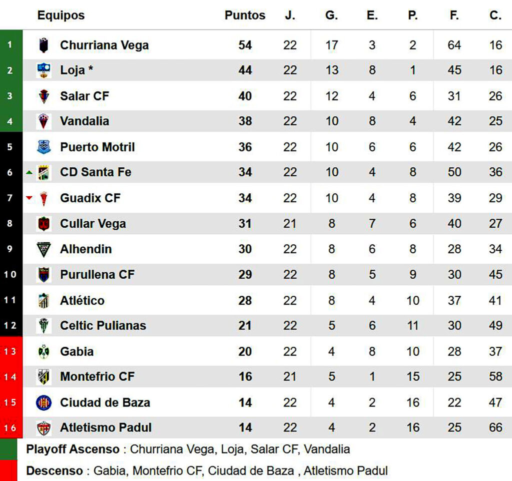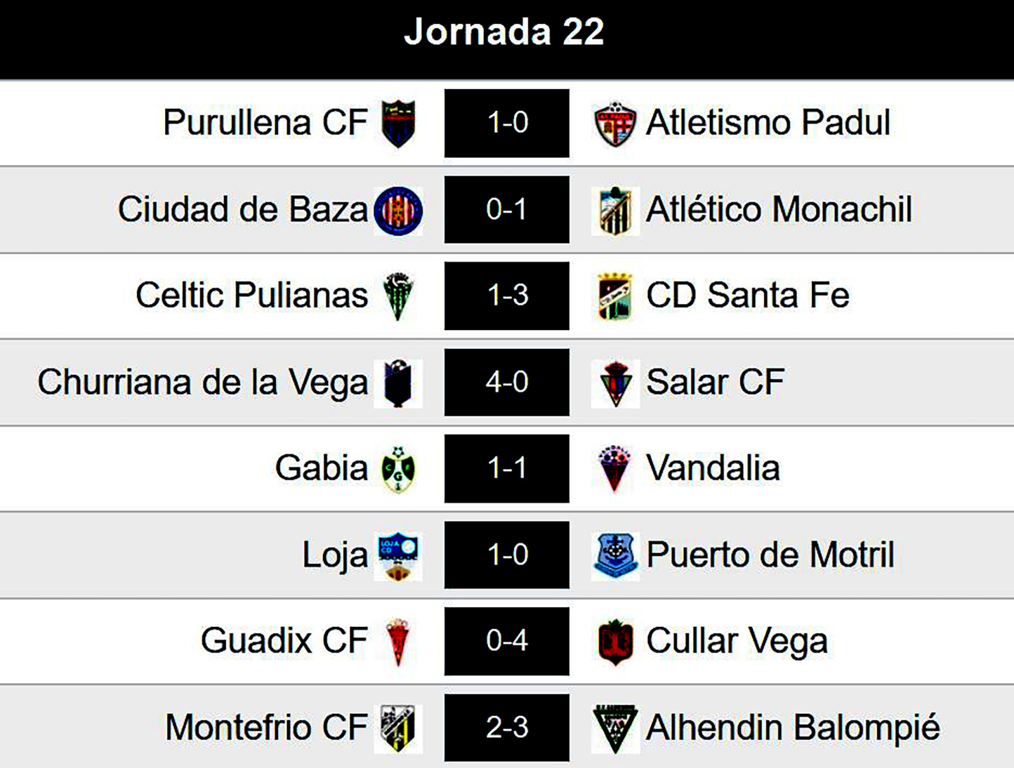 Resultados y clasificación en el grupo granadino de la Primera Andaluza Senior de Fútbol, tras la 22ª jornada (Clicar en las imágenes para ampliar).