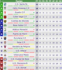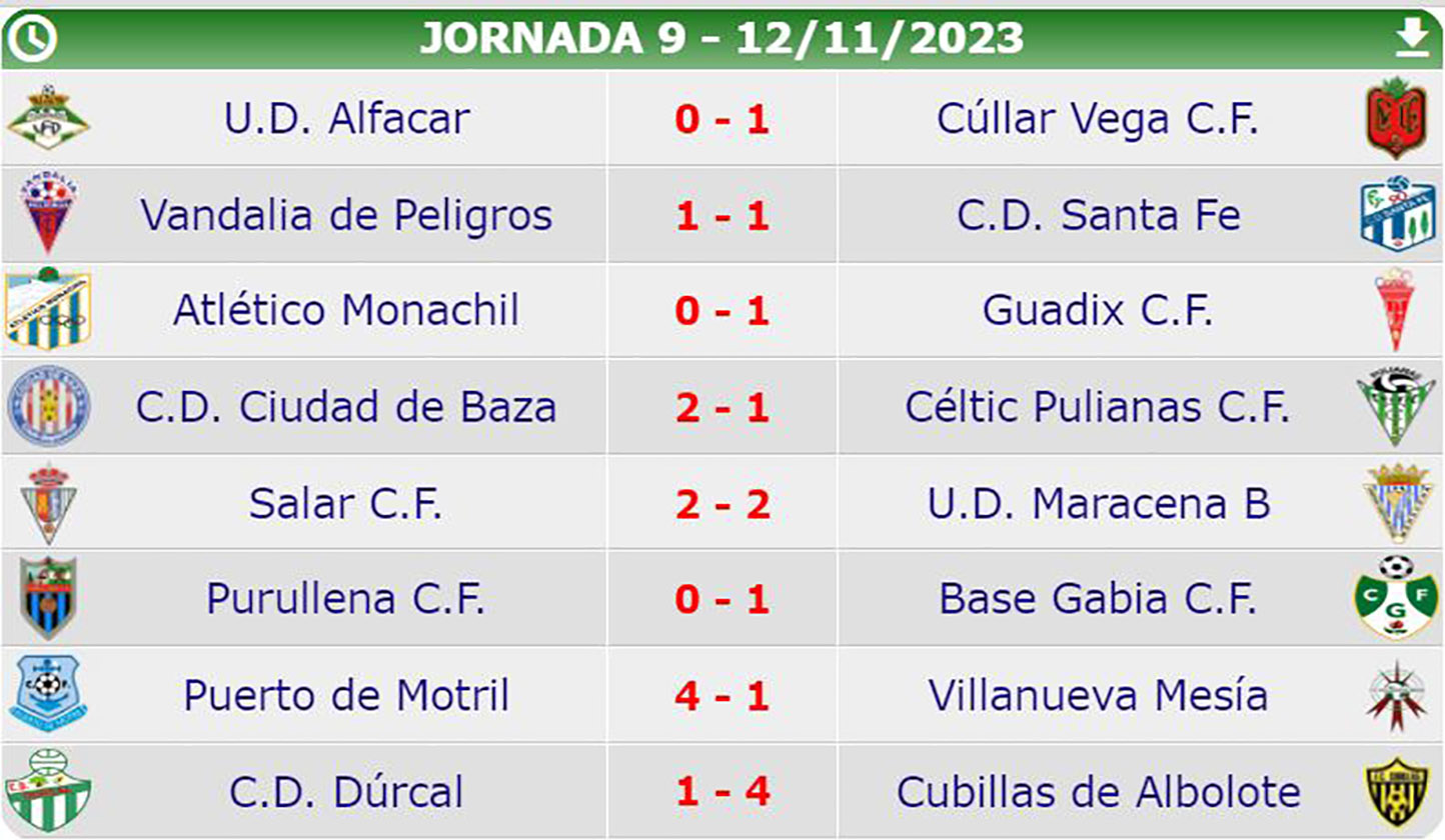 Resultados y clasificación en el grupo granadino de la 2ª Andaluza Senior de fútbol, tras la jornada 9. (Clicar en las imágenes para ampliarlas):