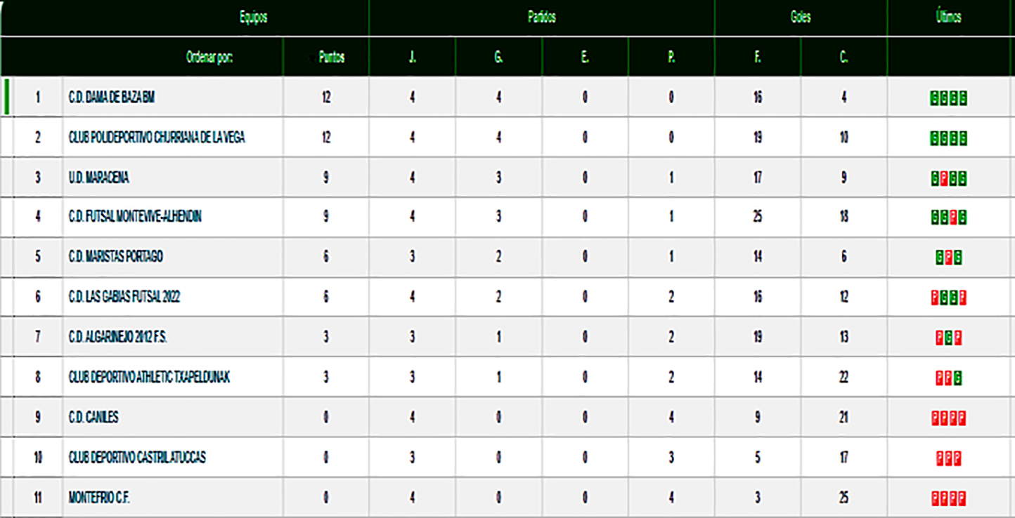 Tras la cuarta jornada el equipo de C.D. Dama de Baza es líder, con 12 puntos, empatado con el Churriana de la Vega. La próxima semana se desplazará hasta la capital, para jugar contra el Club Deportivo Athletic Txapeldunak, que actualmente se encuentra clasificado en octava posición, con un partido ganado y dos perdidos.