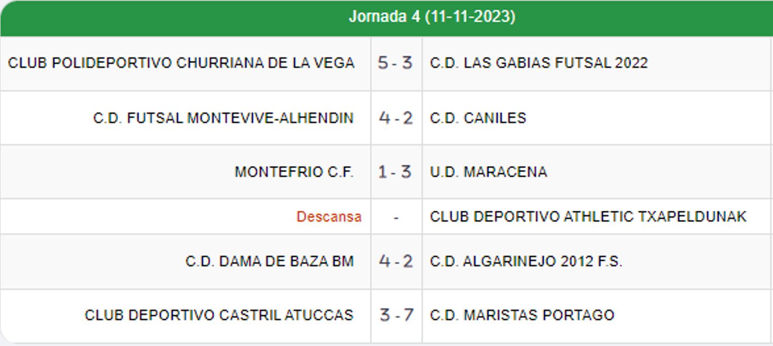 Resultados y clasificación en el grupo granadino de la 2ª Andaluza de fútbol Sala, tras la jornada 4. (Clicar en las imágenes para ampliarlas):