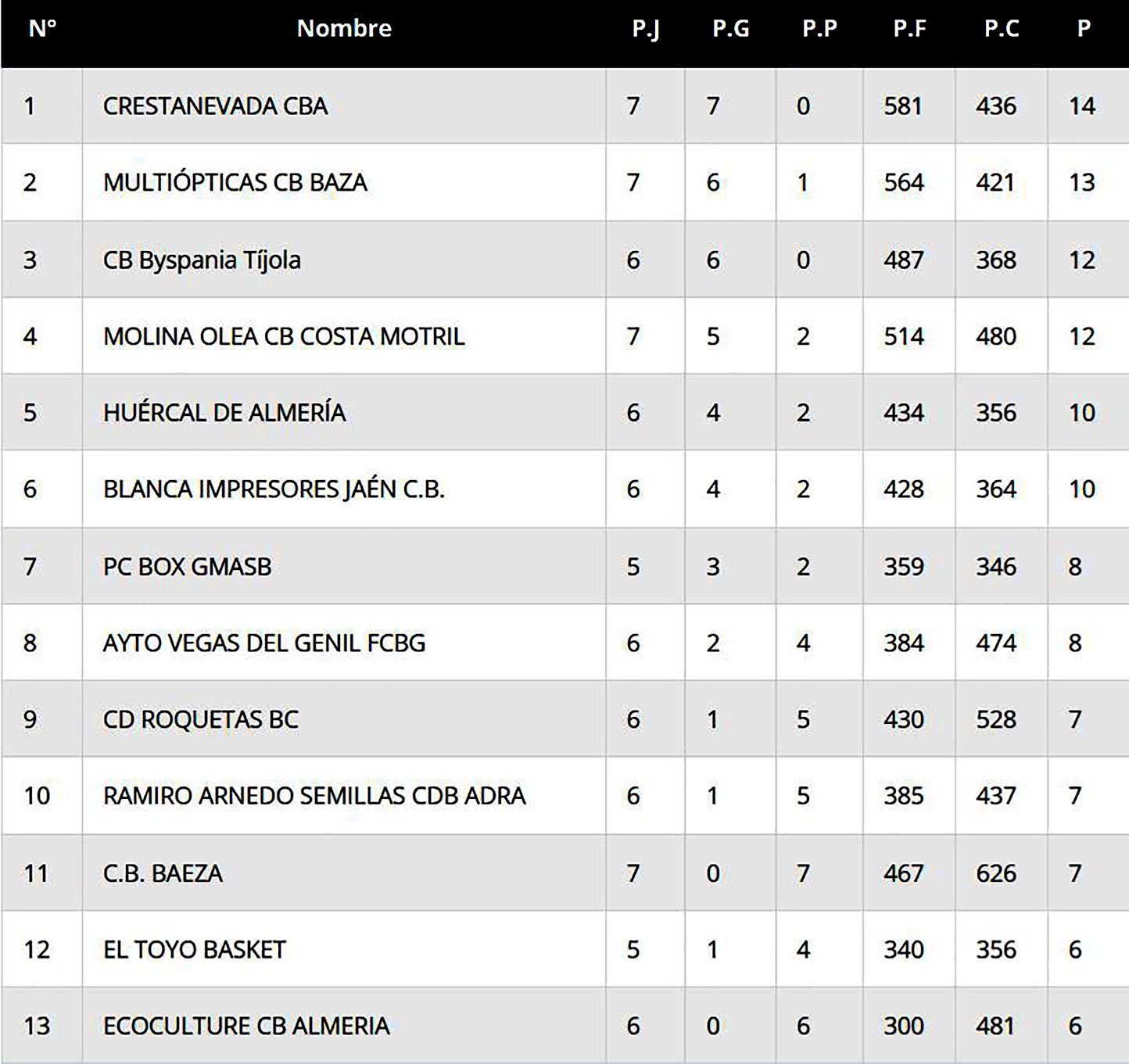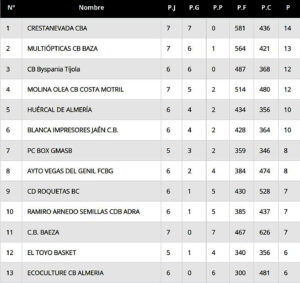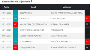 Resultados y clasificación en el grupo C de la Primera nacional Andaluza de baloncesto, tras la disputa de la jornada 7. (Clicar en las imágenes para ampliarlas):