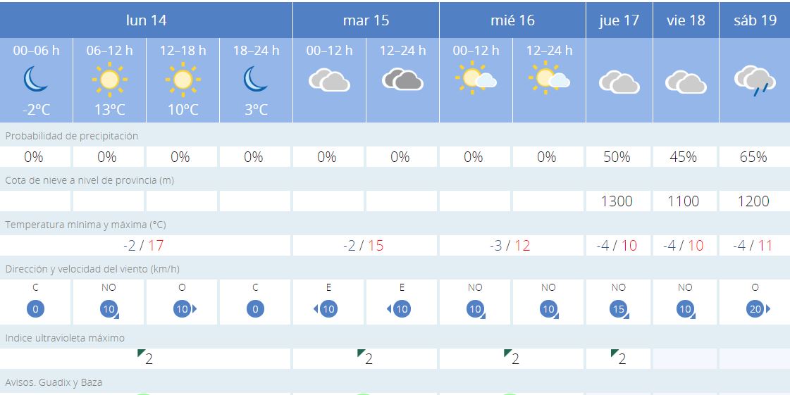 Cielos que se empezarán a cubrir mañana y frío con mínimas que permanecen bajo cero darán paso a la llegada de las lluvias de cara al fin de semana. Como ya comentábamos en nuestra última edición del pasado viernes, la ola de frío arreciaba durante el fin de semana  y los termómetros siguieron bajando. Baza, que registró el viernes la mínima de Andalucía, con 7,5 grados bajo cero, siguiendo en esa tendencia y, un día después, el sábado llegaba a los -8,6ºC, según los datos de la Agencia Estatal de Meteorología (Aemet), situándose entre los puntos más fríos del país (y el más frío de Andalucía, de nuevo), tras el Puerto El Pico, en Ávila (-9,9º), y otras tres localidades de Zamora, Guadalajara y Albacete.