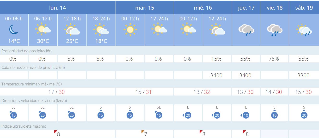 Como datos más destacados, podemos aventurar la bajada de las temperaturas mínimas y la llegada de la lluvia, hacia el fin de semana, acercándonos ya a valores más otoñales y propios de nuestra zona, mientras las temperaturas durante el centro del día seguirán estando en torno a los 30 grados.