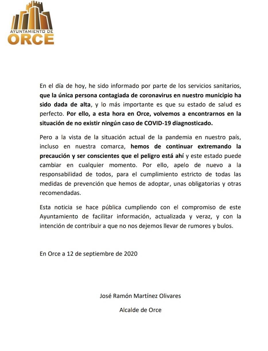 Orce se congratula de que vuelve a ser un municipio libre de Covid-19 y recuerda que el peligro sigue estando ahí y precisa continuar extremando las precauciones. El alcalde orcerino, José Ramón Martínez Olivares, se ha dirigido a la población de su municipio, para comunicarles que ha sido informado por los servicios sanitarias de que ha sido dada de alta la única persona de este municipio que había sido contagiada por el coronavirus.