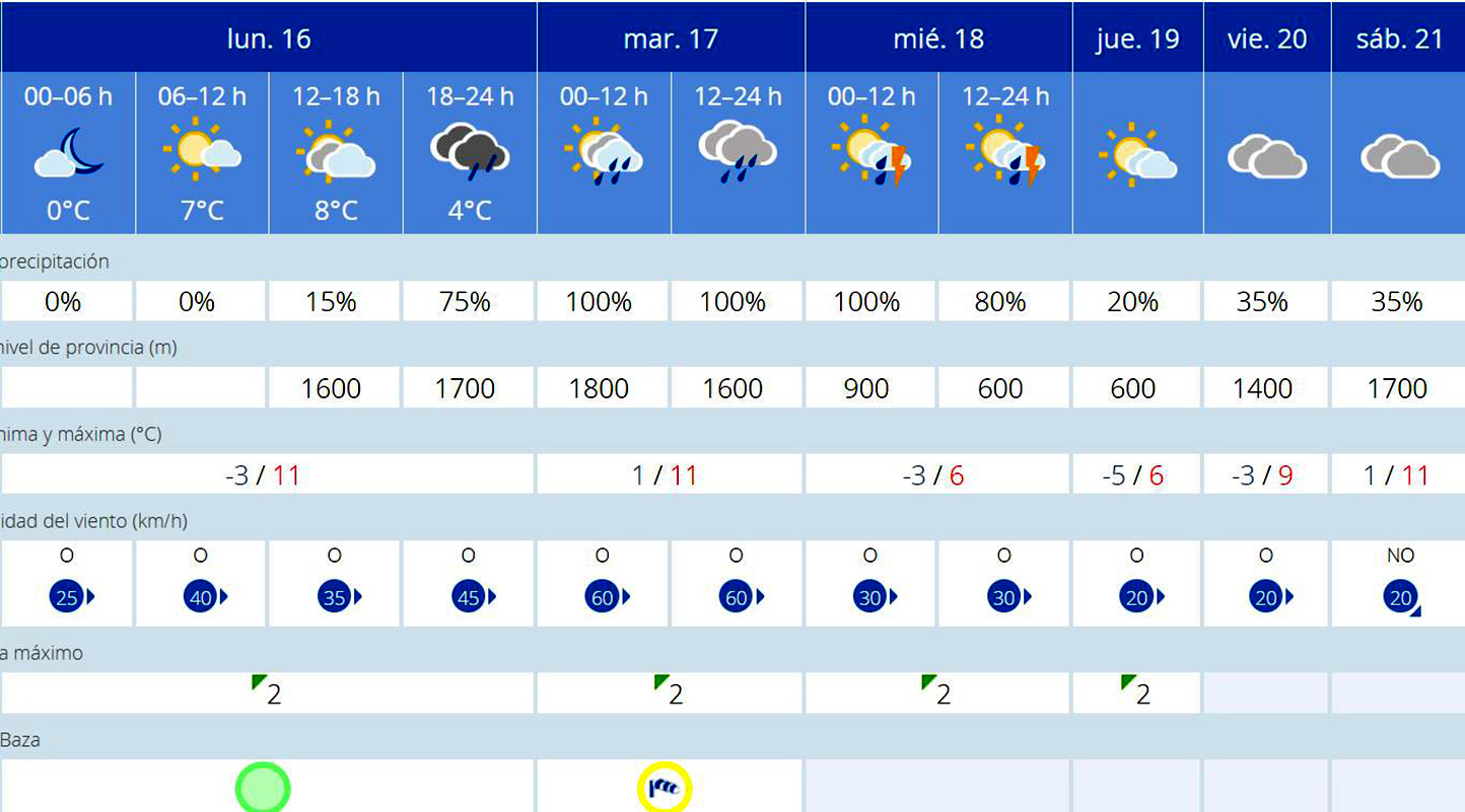 Un cambio con el que llegan las altas posibilidades de lluvias, empezando por un 95% para esta madrugada, un 75% para la tarde noche del lunes y un 100% para toda la jornada del martes 17. A estas posibles lluvias les seguirán los primeros avisos con serias probabilidades de nieve, fijados para el próximo miércoles, con una primera parte de la jornada en una cota de 900 metros de altitud y un 100% de probabilidades de precipitaciones y con cota de 600 metros de altitud y un 80% de posibilidades de que haya alguna precipitación, mientras que el jueves seguirá igual la cota de nieve, pero no se esperan precipitaciones.