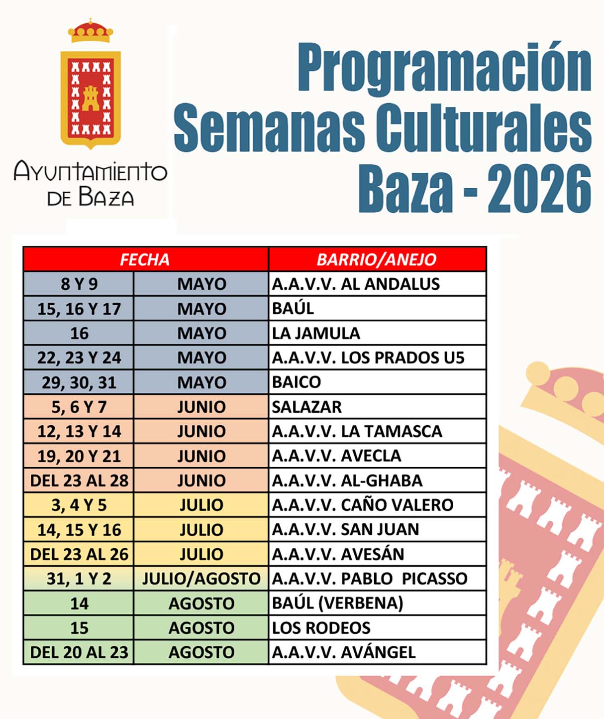 La programación de las Semanas Culturales 2026 ya ha quedado definida tras el encuentro mantenido a mediados de febrero entre Ayuntamiento y representantes vecinales. El calendario arrancará los días 8 y 9 de mayo con las actividades previstas en la Plaza Al Andalus y se prolongará durante todo el verano hasta concluir el penúltimo fin de semana de agosto en el barrio del Ángel.
