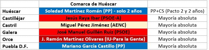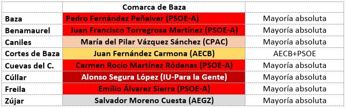 Alcaldes que gobernarán los municipios de las comarcas de Baza y Huéscar. Unos ayuntamientos en los que predominarán las mayorías absolutas, aunque con circunstancias particulares en la cabeza de comarca oscense, donde PP y C’s se parecerán al gobierno decidido en Madrid para la capital de provincia y repartirán en periodos de dos años el gobierno de ambos partidos.