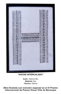 El poeta experimental natural de Baza, Ramón Peña Oliver (Raimon Blu), suma este reconocimiento a su trabajo artístico a otros recientemente recibidos, como la mención especial a su poema “H Intercalada”, en el III Certamen Internacional de poesía Visual Villa de Bormujos, el pasado mes de diciembre, o su obra titulada “Tópicos Ibéricos Soltos” que formará parte de la exposición colectiva internacional “Stands mundiales de poesía multimedia”, que se instalará a partir del día 20 de junio del 2019 en el centro de Évora – Portugal (Ciudad Patrimonio de la Humanidad de la UNESCO y candidata a Capital Europea de la de la Cultura), consistente en un Tótem con pantallas digitales donde se proyectaran obras visuales seleccionadas de artistas de todo el mundo, de forma ininterrumpida.