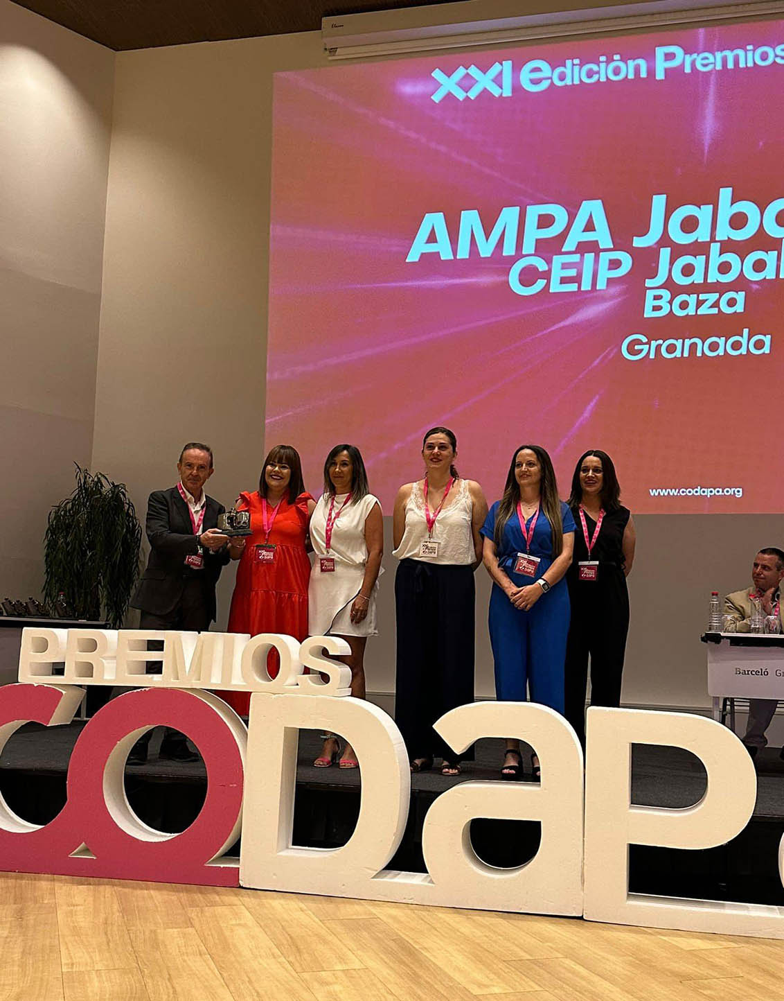 El AMPA Jabalbasti del CEIP Jabalcón de Baza recibe el Premio CODAPA, por su labor en defensa de la escuela pública. Un galardón que ha sido concedido por la Confederación Andaluza de Asociaciones de Madres y Padres del Alumnado Por la Educación Pública, CODAPA, una entidad que agrupa a más de 2.800 asociaciones de madres y padres del alumnado de todo el territorio andaluz, defendiendo los valores de la escuela pública, de la educación pública de la diversidad y la inclusión, el respeto y la igualdad, desde hace ya más de cuarenta años.