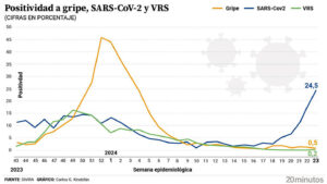 Según los últimos datos del ISCIII, la tasa de infecciones respiratorias (gripe, Covid y VRS) a nivel nacional es de 439,6 casos por cada 100.000 habitantes, mientras que la semana anterior fue de 428,9. En términos de positividad a las pruebas rápidas de detección que se realizan en la red centinela, la gripe ha bajado en la última semana de 1,8% a 0,5%, el virus respiratorio sincitial (VRS), causante de las bronquiolitis, se mantiene en torno al 0% y la Covid sigue escalando, pasando de 19,9 a 24,5% en atención primaria.