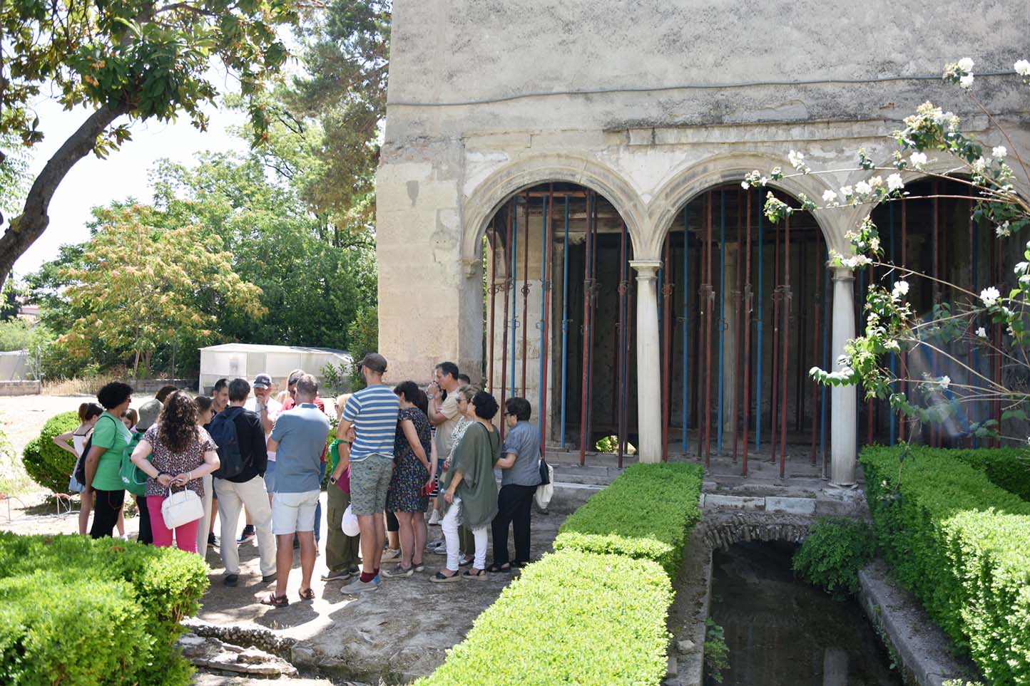 Durante la visita se pudo transitar por los espacios arquitectónicos mejor conservados del edificio y se prestó especial atención a varias zonas del jardín, donde se han detectado numerosas estructuras ocultas bajo la superficie del terreno. Por una parte, en el área que se extiende entre la fachada sur del palacio y la Iglesia de San Jerónimo, donde se ha detectado una gran densidad de restos a poca profundidad. Por otra, en el desarrollo del jardín hacia levante, donde se encuentra la alberca que se extiende a los pies de la fachada este del palacio, hoy oculta bajo el nivel del jardín, pero que estuvo en uso hasta mediados del siglo XX. En esta zona se pudo presenciar in situ el método desarrollado por el equipo del Instituto Andaluz de Geofísica de la UGR, para obtener datos de elementos ocultos bajo el subsuelo, mediante técnicas de prospección geofísica.