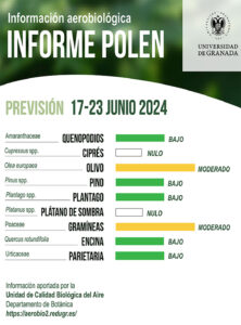 Aunque tienden a disminuir, todavía siguen en niveles altos el polen del olivo y el de las gramíneas. La Unidad de Calidad Biológica del Aire CBA-UGR estima que para la próxima semana los niveles de polen de olivo y gramíneas ya alcancen niveles moderados, por lo que es probable que la sintomatología en aquellas personas sensibilizadas a estos tipos polínicos mejore. Sin embargo, para este fin de semana se siguen esperando niveles de polen alto. Las esporádicas precipitaciones que se prevén podrían crear un efecto lavado y disminuir algo los niveles de polen en el aire.