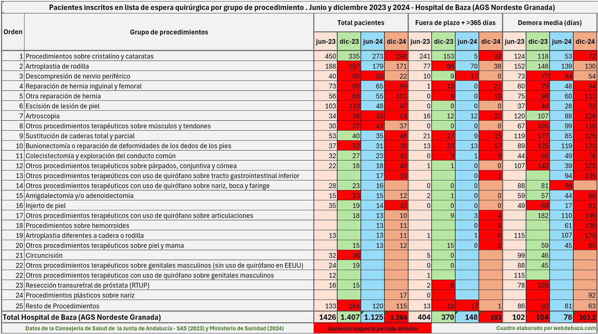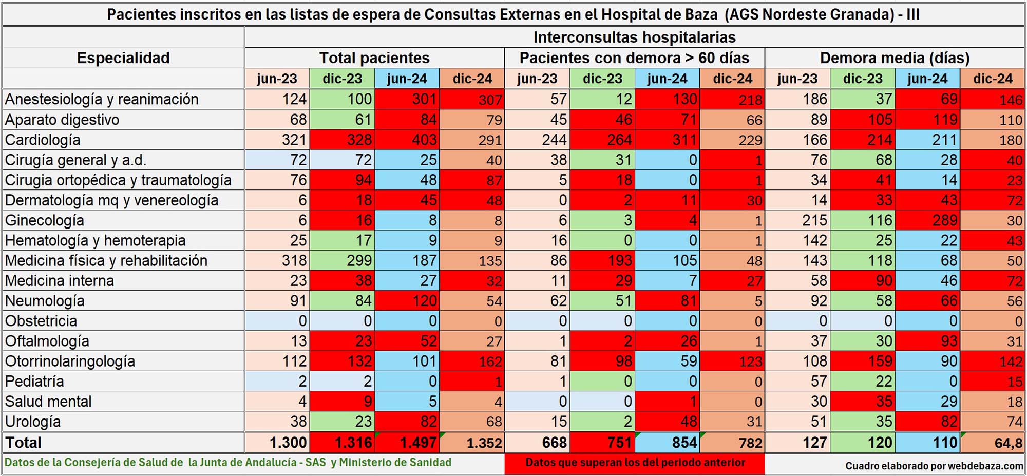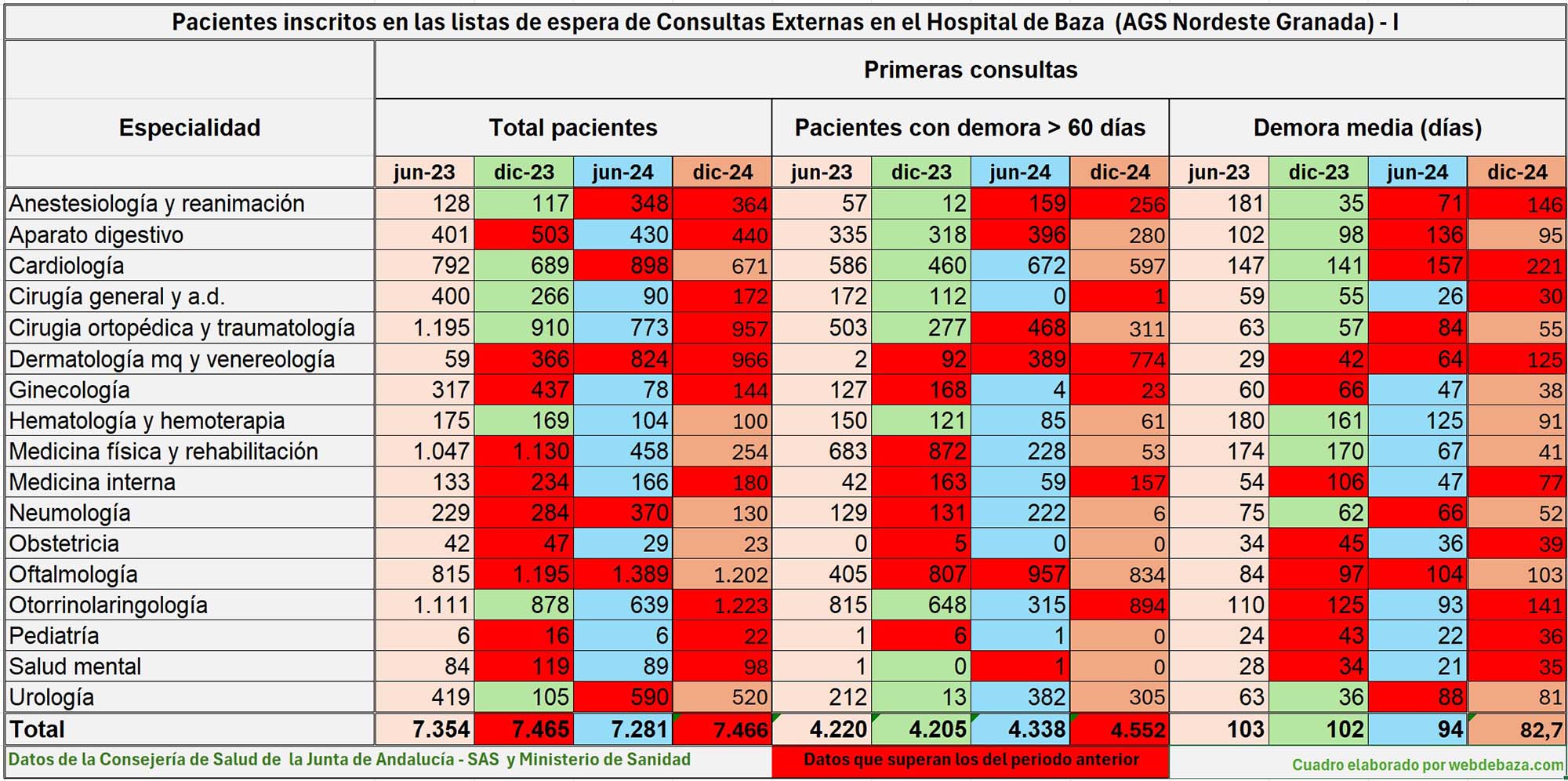 El último informe de la Consejería de Salud sobre las listas de espera confirma mayores demoras en sus consultas y cirugías en el Hospital de Baza. Con fecha de 31 de diciembre de 2024, los datos reflejan un incremento generalizado en los tiempos de espera tanto para intervenciones quirúrgicas como para consultas externas. Aunque las demoras superiores a 60 días en las interconsultas hospitalarias han mejorado, la tendencia sigue siendo preocupante en la mayoría de los procedimientos.