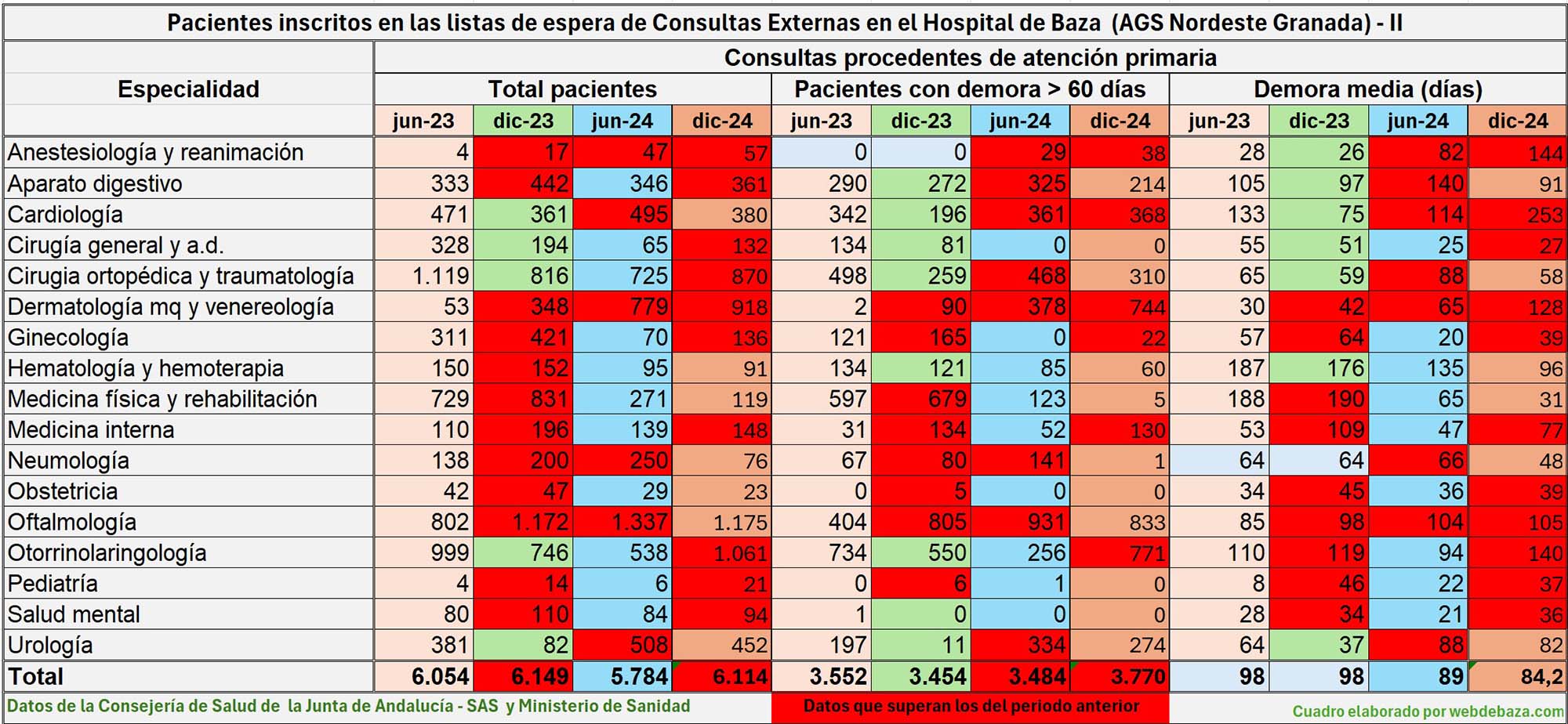A pesar de algunas mejoras puntuales, el balance general sigue dejando un sabor amargo. El Hospital de Baza continúa acumulando retrasos en diversas especialidades, con tiempos de espera que, en muchos casos, se alejan de los objetivos marcados por la administración sanitaria.