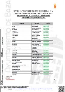 Publicado el listado provisional de solicitudes concedidas en el marco de ayudas para fomento del desarrollo de la actividad económica. El Ayuntamiento de Baza ha publicado en el tablón municipal de anuncios de su web municipal el listado provisional de solicitudes concedidas en el marco de las ayudas para el fomento de la actividad económica, la cual se puede visualizar también en este enlace.
