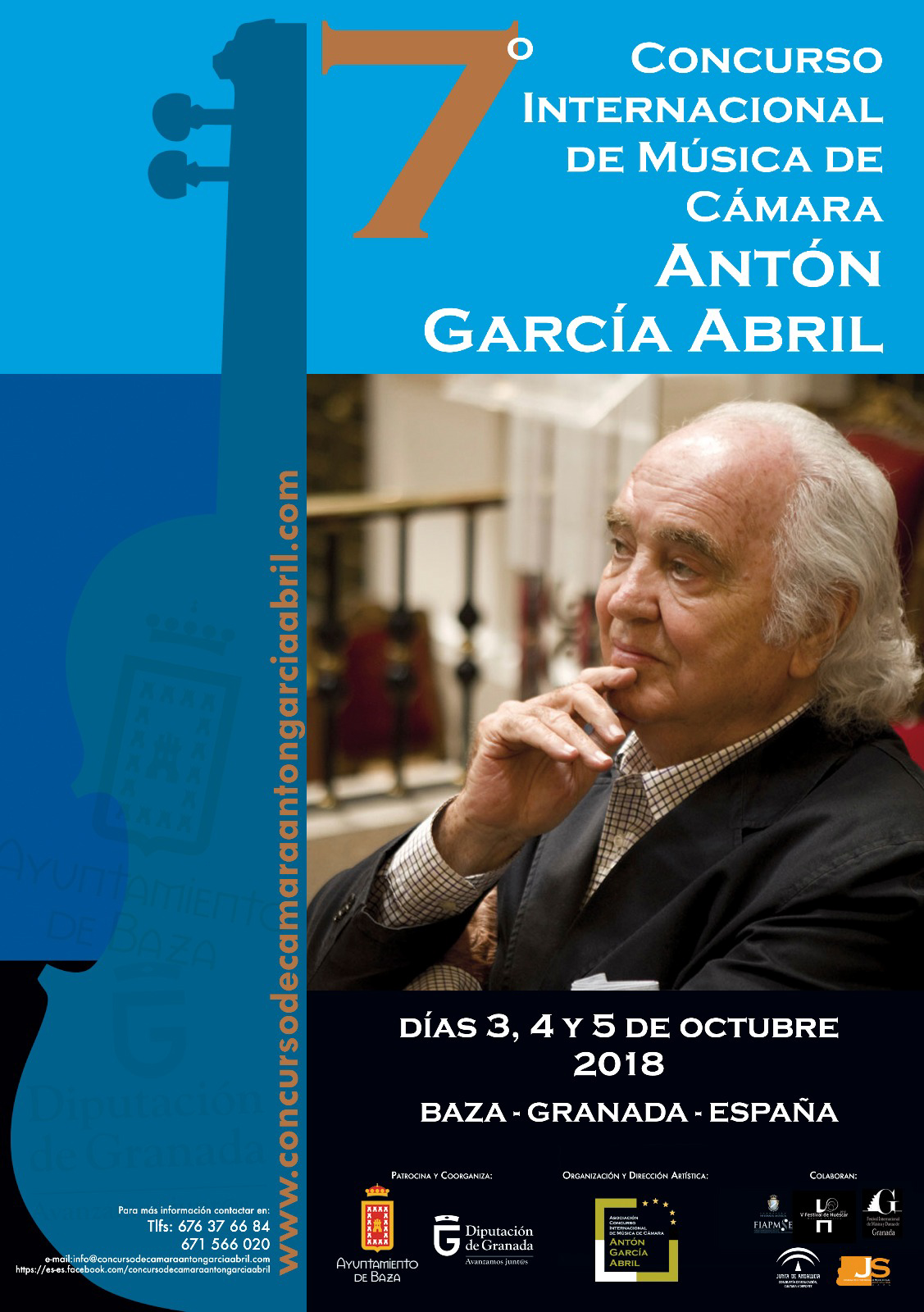 En un año plagado de homenajes por el 85 aniversario de Antón García Abril, el maestro vuelve a Baza para formar parte esencial del concurso como presidente del jurado, tal y como lleva siendo desde la primera edición. La organización del Concurso y las instituciones patrocinadoras -Ayuntamiento de Baza y Diputación de Granada- agradecen al maestro su compromiso con este proyecto, que atrae a decenas de concursantes cada año a la ciudad, muchos procedentes de toda Europa, y que representa uno de los concursos internacionales de música de cámara de mayor prestigio del panorama español.