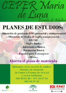 Hoy lunes, día 17 de septiembre, a las 18:00 horas, el CEPER María de Luna -Escuela de adultos- ofrece una sesión informativa sobre la oferta para el curso que acaba de comenzar. El CEPER María de Luna o Escuela de Adultos ofrecerá, a las seis de esta misma tarde, una sesión informativa dirigida a todas las personas que puedan estar interesadas en sus actividades formativas para el curso 2018-19, en las que se ofrecen los siguientes Planes de Estudios: