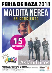 El Ayuntamiento de Baza y 16 Escalones, promotora de los conciertos para la feria y fiestas del municipio este año, se vieron ayer obligados a suspender las actuaciones de Maldita Nerea, Aslándticos y Apaga&Vámonos, previstas en el Campo de Fútbol Alameda a las 22:30, por causas meteorológicas. Al ser éste un recinto al aire libre, las lluvias que cayeron ayer en la localidad podrían haber puesto en peligro la seguridad de trabajadores, artistas y público, así como equipos de iluminación y sonido.