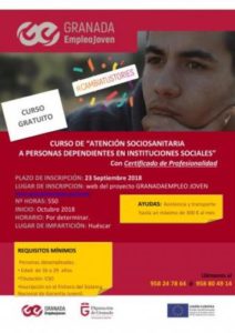 Huéscar ofrece un itinerario formativo sobre Atención Sociosanitaria a Personas Dependientes en Instituciones Sociales. Desde la Diputación de Granada, en el marco del proyecto Granadaempleo Joven se va a desarrollar un nuevo itinerario en Huéscar, de la especialidad Atención Sociosanitaria a Personas Dependientes en Instituciones Sociales. Ya está abierto el plazo de inscripción de personas beneficiarias en la web del proyecto, hasta el 23 de Septiembre de 2018.