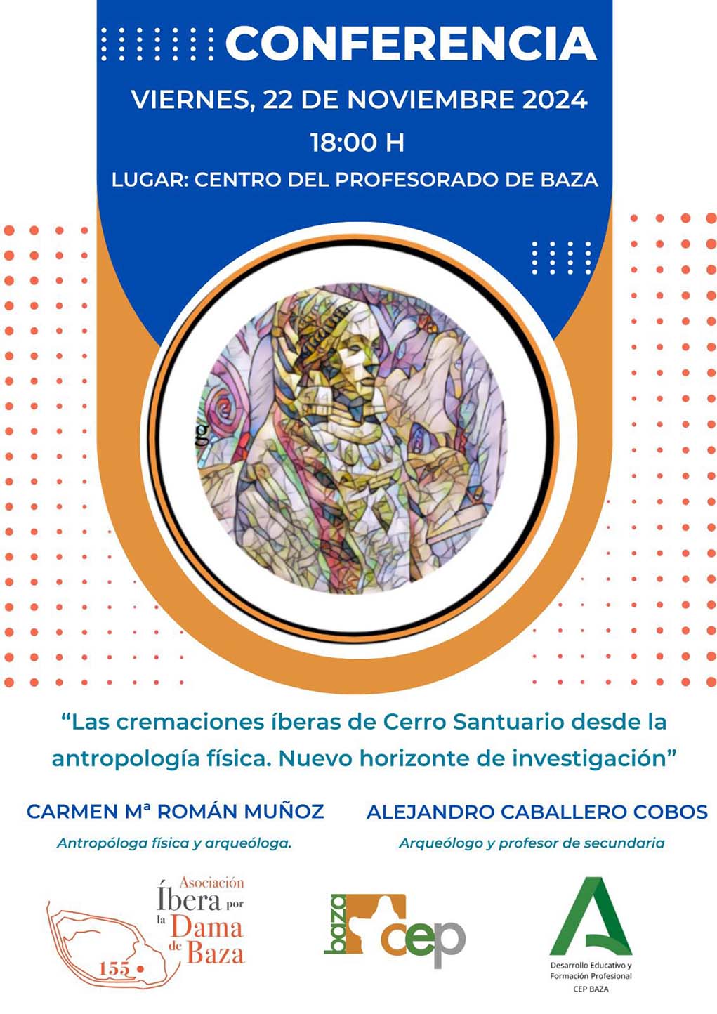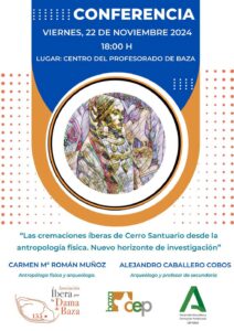 Conferencia en el Centro del Profesorado de Baza (CEP) sobre los rituales de cremación íberos en el Cerro Santuario. El próximo 22 de noviembre a las 18:00 h, el Centro del Profesorado de Baza (CEP), en colaboración con la Asociación Íbera por la Dama de Baza, ofrecerá una conferencia titulada “Las cremaciones íberas de Cerro Santuario desde la antropología física: Nuevo horizonte de investigación”. Este evento pretende acercar a la comunidad local los últimos avances en el estudio de los rituales funerarios íberos a través de la investigación arqueológica y la antropología física.