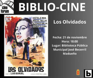 El ciclo «Biblio-cine» se inaugura el jueves 21 de noviembre a las 18:00 horas con la proyección de Los Olvidados, de Luis Buñuel, un clásico del cine libre de derechos. Esta actividad, que responde a una solicitud de los propios usuarios de la biblioteca, seguirá el formato de cinefórum, invitando a los asistentes a disfrutar de la película y participar en un coloquio posterior. La entrada es libre y, para hacer la experiencia más completa, se ofrecerán palomitas.