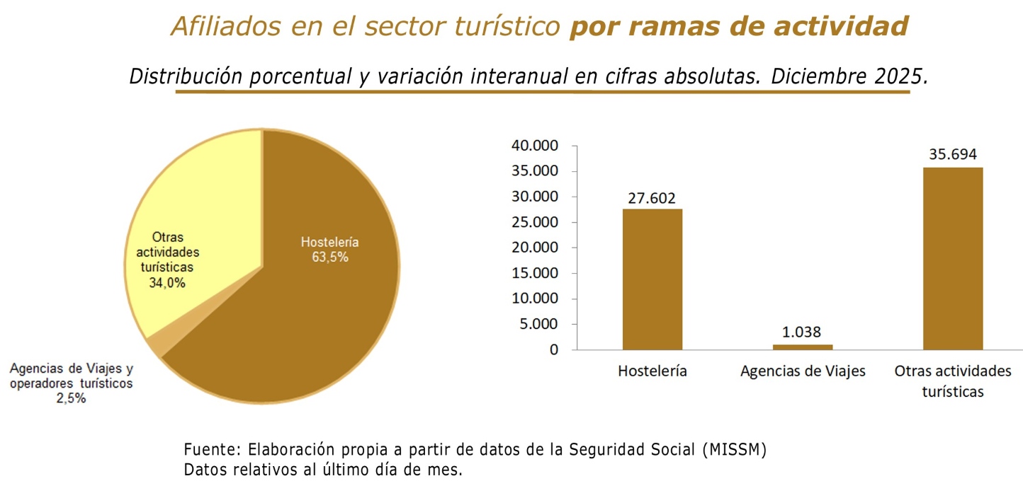 De este modo, en el último mes del año la variación de los afiliados vinculados a actividades turísticas ha sido positiva en todas las ramas turísticas. Así, en hostelería se registra un aumento de 27.602 afiliados (9.028 en los servicios de alojamiento y 18.574 en los servicios de comidas y bebidas) mientras que en agencias de viajes se registra un incremento de 1.038 trabajadores. En las otras actividades turísticas el aumento fue de 35.694 trabajadores.