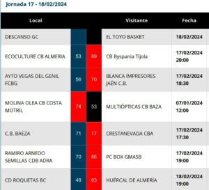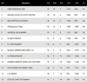 Resultados y clasificación en el grupo C de la Primera Nacional Andaluza Sénior de Baloncesto. (Clicar en las imágenes para ampliarlas): Una jornada en la que el Multiópticas Baza adelantó su visita al CB Costa Motril, disputando su partido el pasado 7 de enero.