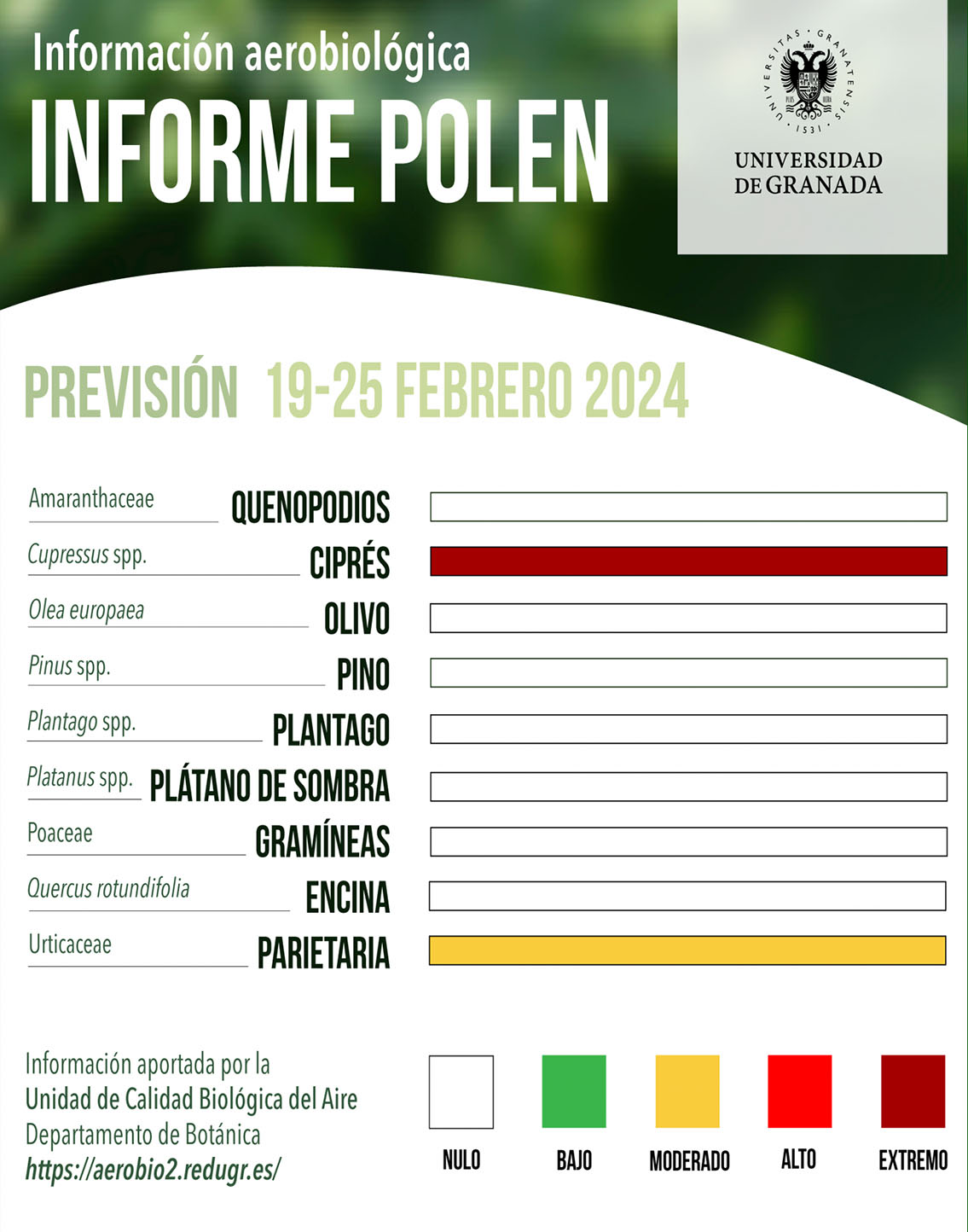 Las recientes precipitaciones han logrado limpiar la atmósfera, descendiendo bruscamente los niveles de polen de ciprés y parietarias. De presentar valores extremos (por encima de 1000 granos/m3) y moderados (superiores a 25 granos/m3), durante el fin de semana se alcanzaron niveles bajos (por debajo de los 50 y 10 granos/m3, respectivamente). No obstante, para los próximos días y comienzos de la semana se esperan temperaturas cercanas a los 20º, sin precipitaciones, por lo que la UCBA-UGR estima que de nuevo los niveles de ambos tipos polínicos vuelvan a aumentar a valores extremos para ciprés y moderados para parietaria.