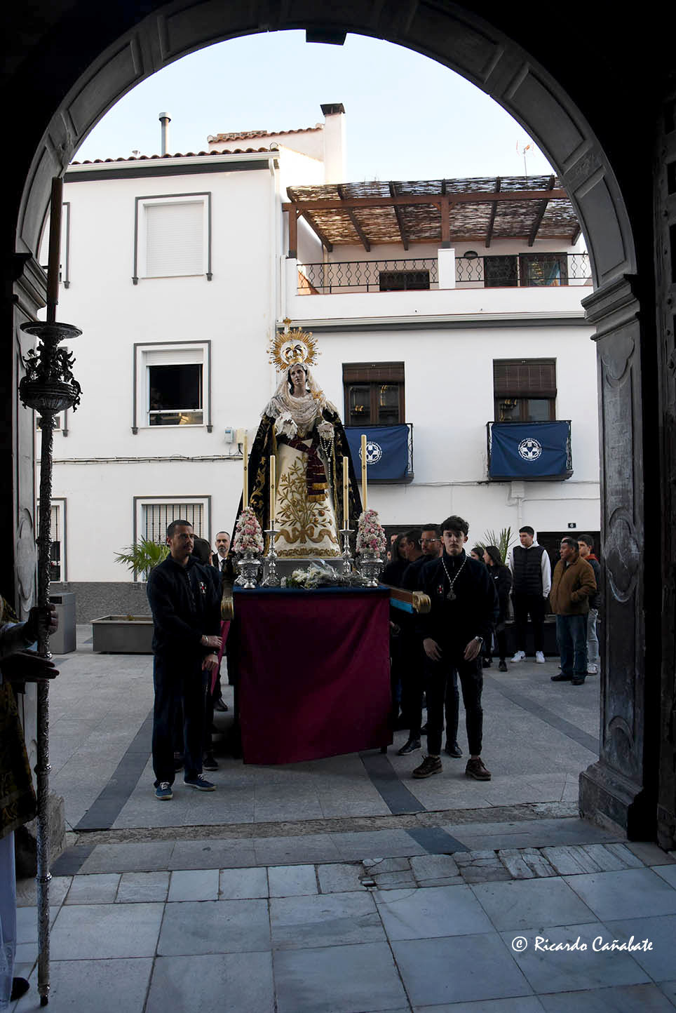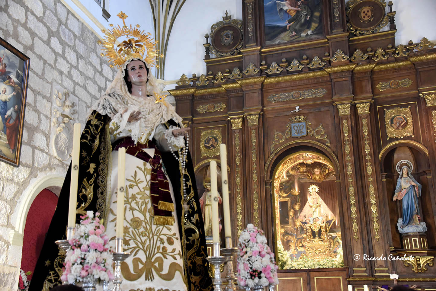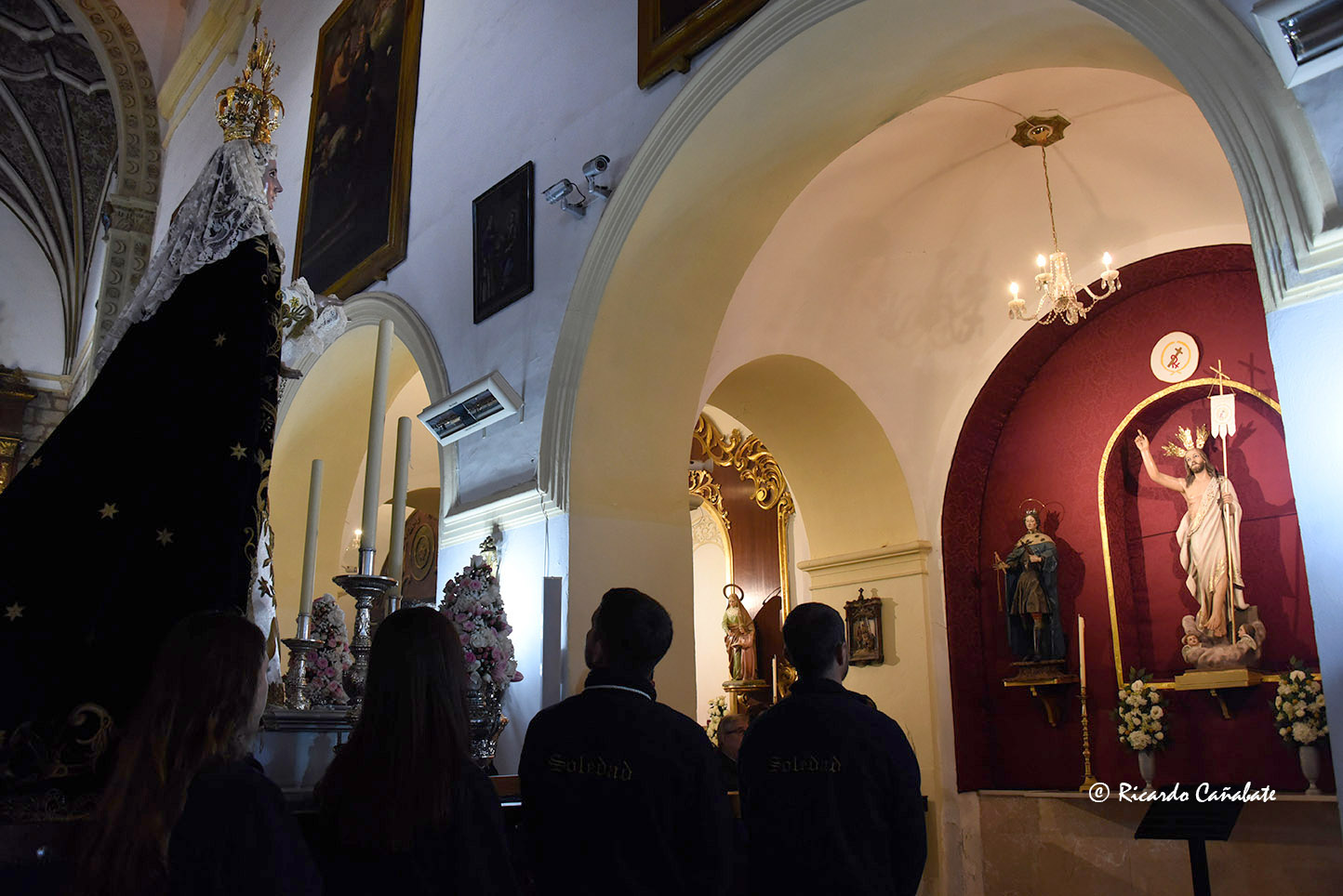 Llegados al antiguo templo mercedario, la Virgen de la Soledad rindió saludo al Stmo. Cristo de la Misericordia y a Jesús Resucitado, con quienes comparte la titularidad de la cofradía que lleva sus nombres y que popularmente se conoce con el nombre de la Virgen. Tras ser ubicada en el altar, se procedió al rezo del Santo Rosario y a una solemne Eucaristía de bienvenida y acción de gracias a la Virgen de la Soledad, así como la Sabatina semanal, a cuyo final se realizó un besamanos a la Virgen, pudiendo ser apreciada de cerca por los fieles que habían acudido a darle la bienvenida en el día de su retorno, terminando la tarde con una Hora Santa dirigida por los misioneros.